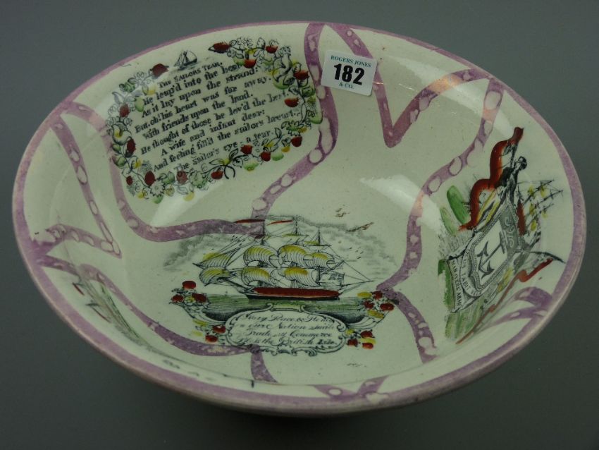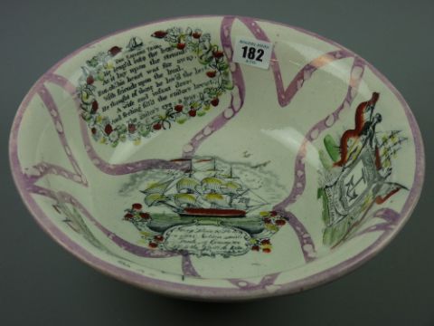 Sunderland lustre - a circular pedestal basin 'Mariner's Arms', 'Mariner's Compass', 'May Peace and Plenty' etc, 28 cms diameter, 12 cms high