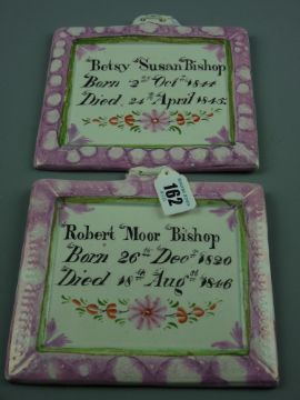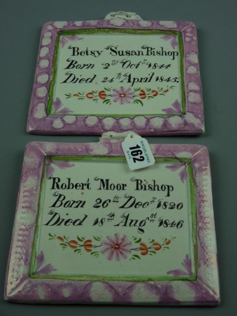 Sunderland lustre - a pair of pink bordered memorial plaques for 'Robert Moore Bishop, 1820-1846' and a child 'Betsy Susan Bishop, 1844-1845', 15 x 16 cms (each with original Sotheby's Lot label for 5th February, 1998)