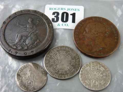 Three silver coins - a William & Mary one shilling, a 1746 Lima sixpence piece, a 1787 sixpence piece, a 1797 bronze two pence piece and an 1854 bronze penny