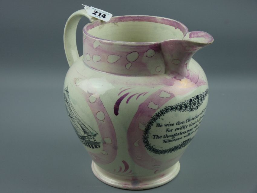 Sunderland lustre - a large sailor's jug 'Be Wise Then Christian While You May, For Swiftly Time is Flying', 20 cms high (fading and chip to top rim)