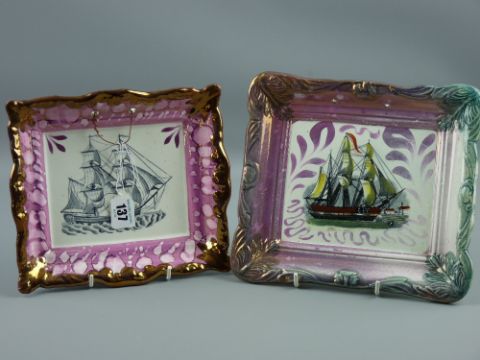 Sunderland lustre - an oblong plaque with twinmaster, impressed mark to the base and another oblong plaque with a twinmaster and port buildings in the background