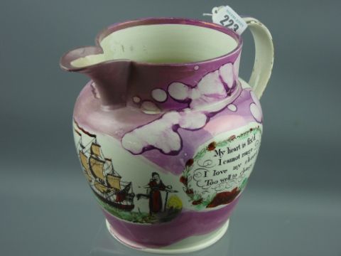 Sunderland lustre - a large sailor's jug with triplemaster and two four line ditties, 19 cms high (repaired spout)
