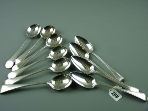 A set of four fine silver serving spoons, the tapered handles with lined edges and monogrammed heads, 9.4 ozs, well marked for London 1796, maker Eley & Fearn, together with a good set of six Sheffield plated soup spoons