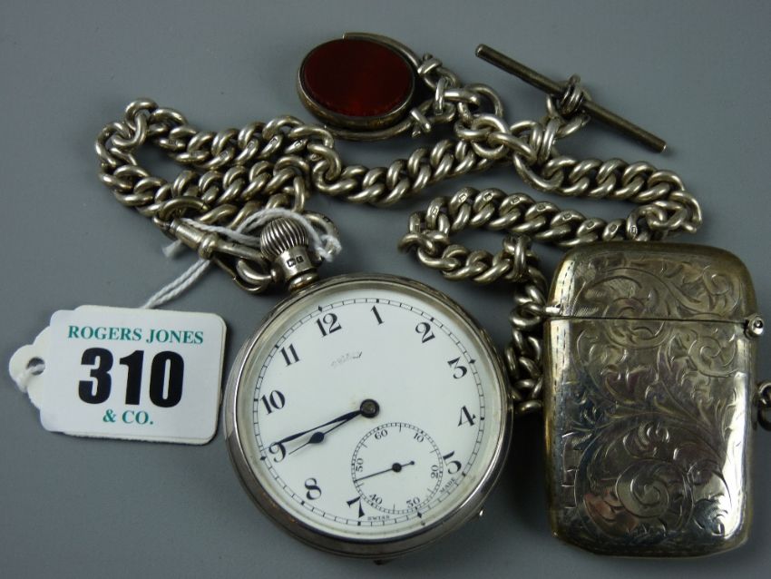 Pocket watch, Albert and vesta - a gent's silver encased pocket watch with plain back, Birmingham 1935 and a bright cut silver vesta each on a silver double Albert chain with T-bar and agate and bloodstone swivel fob, 3 ozs gross excluding watch