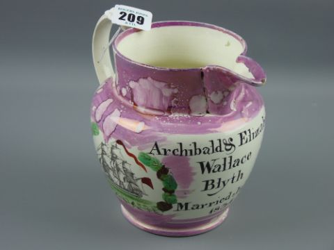 Sunderland lustre - a medium sized marriage and Seaman's jug 'Archibald and Elizabeth Wallace of Blyth, Married July 20th, 1834' also a print of a threemaster and 'Come Seaman Join With One Accord...', 14 cms high