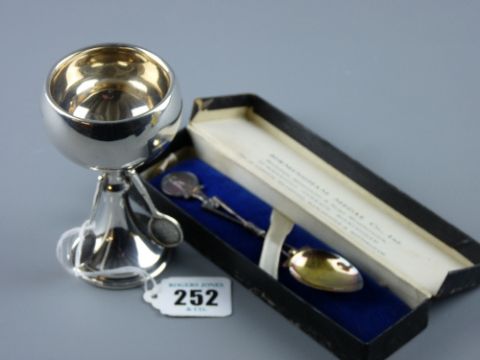 A circular based silver tennis trophy, the column supported by three tennis racquets, 1.6 ozs, Birmingham 1938 and a cased silver golfing trophy spoon, the box labelled 'Birmingham Medal Company Ltd'