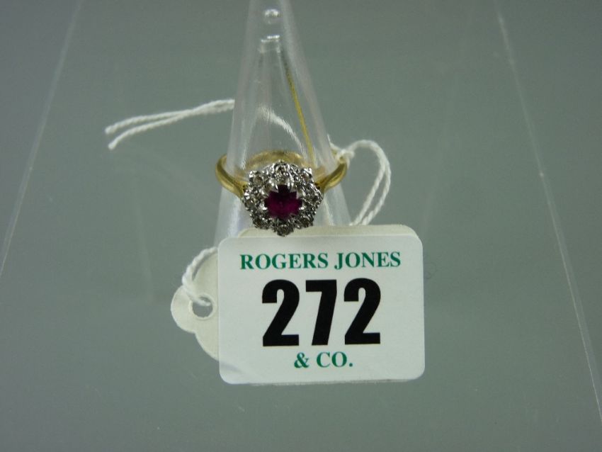 An eighteen carat gold ruby and diamond cluster dress ring having a centre ruby with eight surrounding diamonds, 4.9 grms gross