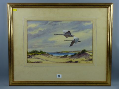 WINSTON MEGORAN watercolour - pair of mute swans flying over dunes, signed, 27 x 42 cms