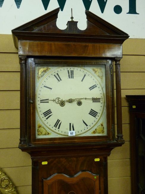 An early 19th Century inlaid mahogany longcase clock, the hood with broken architectural pediment, single glazed door with boxwood string inlay and flanking reeded pillars before a 13.5 ins square dial having shell painted spandrels and Roman numerals, twin wind pendulum driven movement striking on a bell, pendulum and weights included, the trunk door crossbanded and boxwood strung with Sheraton style shell inlay, quarter cut reeded side columns, central panel and trunk base front similarly decorated, unmarked dial, possibly Scottish, 223 x 49 cms