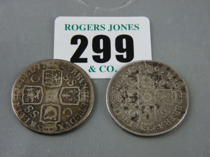 A 1663 silver one shilling piece and a 1723 SSC silver one shilling piece