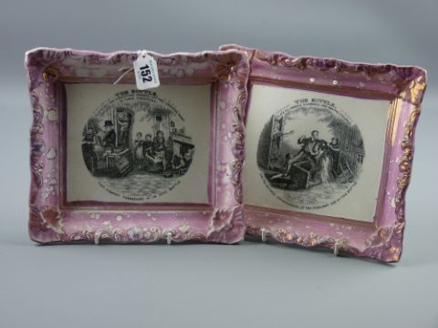Sunderland lustre - two oblong plaques 'The Bottle, Plate Three' and 'The Bottle, Plate Six' by Moore & Co