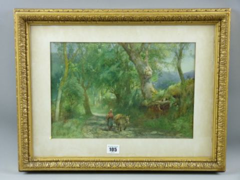 F MERCER watercolour - wooded lane with donkey and woman, signed, 23 x 34.5 cms