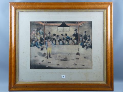 Early 19th Century coloured engraving - featuring 'Billy the Celebrated Rat Killing Dog' performing in a ring with master and surrounded by top hatted spectators. With excellent typed legend verso and in ink 'Purchased From the Duke of Edinburgh Hotel, Reading, December 11th, 1948', 40 x 52 cms