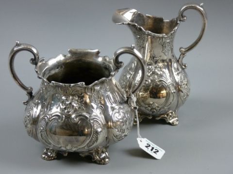 An electroplated twin handled sugar basin and cream jug each with raised and scroll decoration and with four scrolled supports