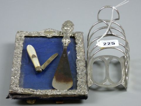 An embossed silver photograph frame, 21.5 x 13 cms, a silver and mother of pearl fruit knife, a silver handled shoe horn and an EP toast rack