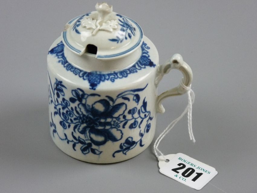 Worcester - circa 1770 blue and white mustard pot and cover decorated in the 'Mansfield' pattern, underglazed blue open crescent mark to the base, 10 cms overall height (chips to floral knop, 9 mm chip to lid)
