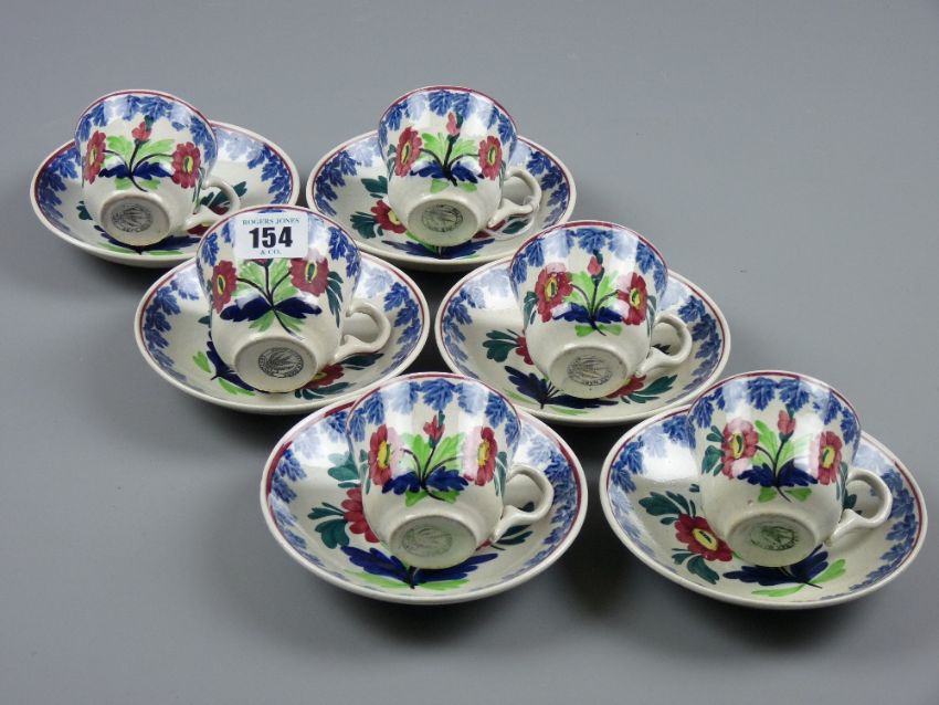 A set of six Portneuf pottery spongeware cups and saucers, stamped to the base 'Auld Heather Ware, Scotland', 5.5 cms cup height, 13 cms saucer diameter (one cup chipped, crazing and staining, one factory flaw handle)