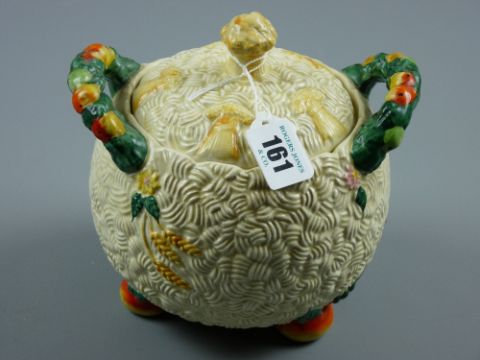 A Clarice Cliff Celtic Harvest biscuit barrel, printed mark to the base 'Clarice Cliff, Newport Pottery Co, England' with embossed word 'England no. 58A', 17 cms high