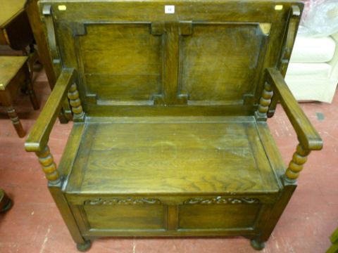 A 20th Century oak Jacobean style monk's bench interior maker's label 'Fyne Ladye', 72 x 91.5 cms closed (some restoration required)