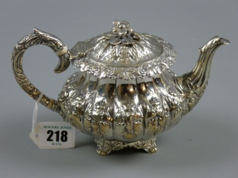 A finely decorated and finely marked circular silver bachelor teapot with raised floral decoration all over on a shaped and scrolled pedestal and with floral topped domed lid, 12.9 ozs, London 1834 by Johnathan Hayne