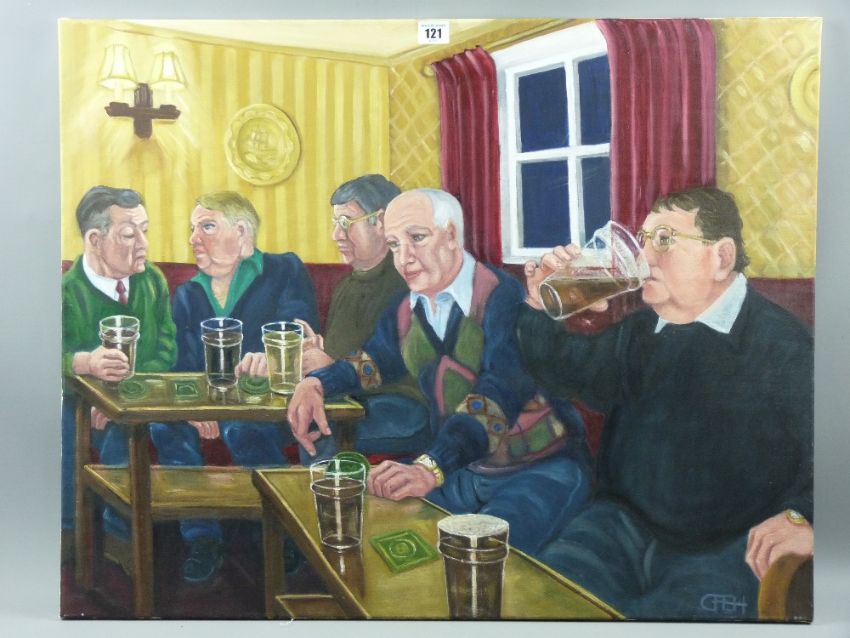 CARL F E HODGSON oil on canvas on stretcher, unframed - 'The Regulars' featuring five gentlemen friends in a pub, signed with monogram, 61 x 76 cms