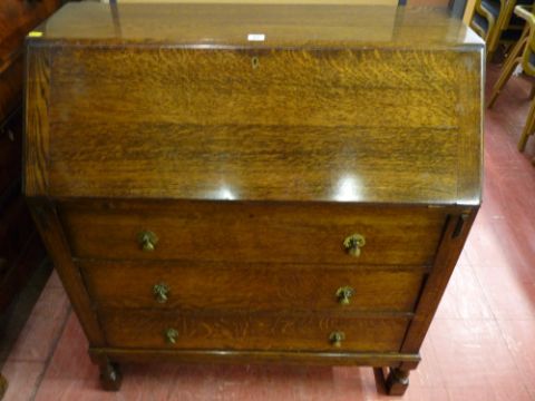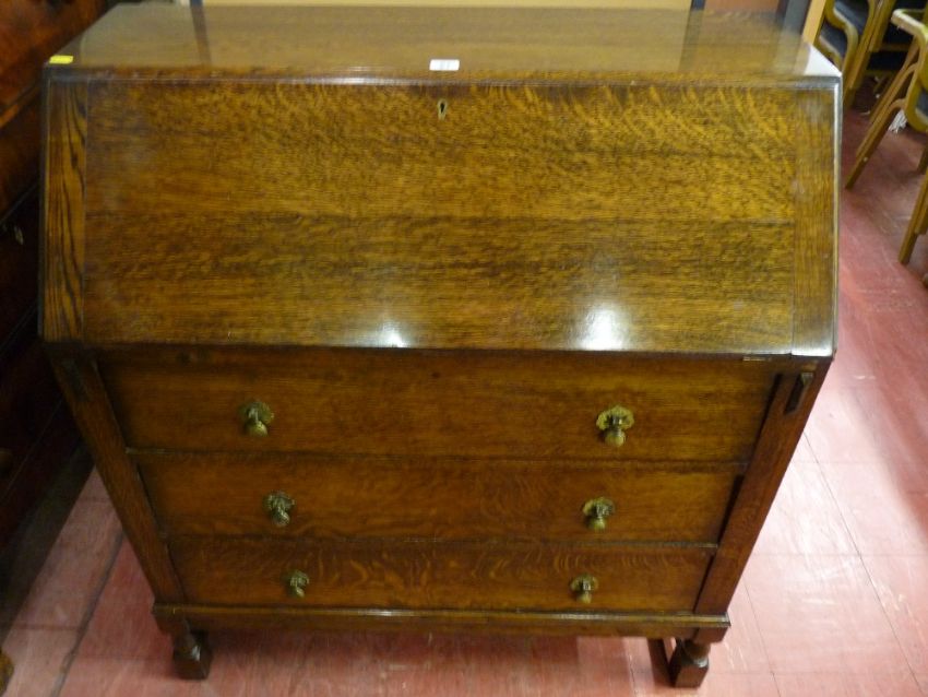 A clean 1930's oak fall front bureau chest on block and turned supports, 100 x 89 cms