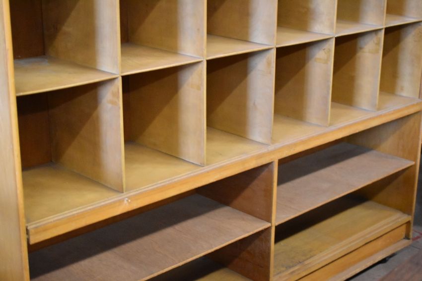 A large lightwood compartmented merchandise unit of thirty six recesses, 205cms high