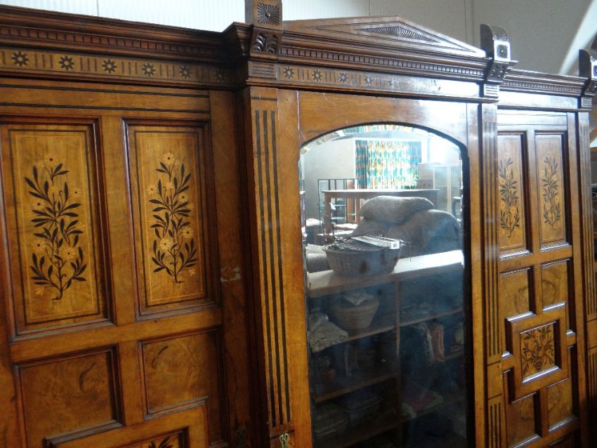 A late nineteenth century marquetry satinwood triple wardrobe of architectural form and having a flanking robes to either side, linen press to the other and a centre arrangement of line drawers and slides to the middle section with mirrored door