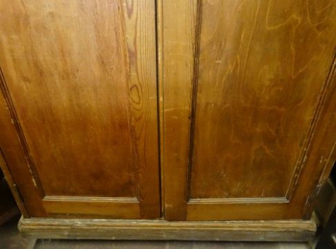 A two door pitch pine chapel closet with metallic handle and internal clothes rails and shelf