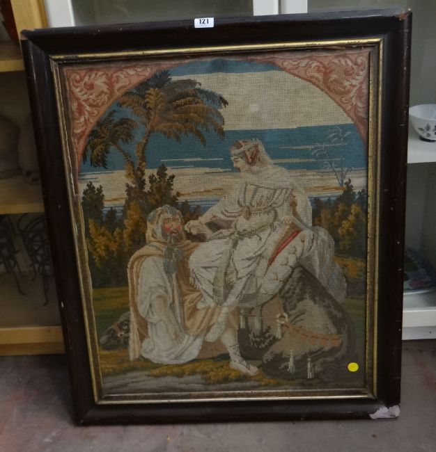 An antique pictorial tapestry in a stained frame with gilt slip depicting two regal figures