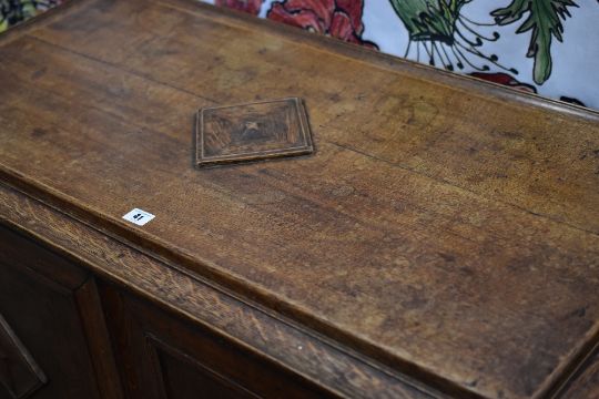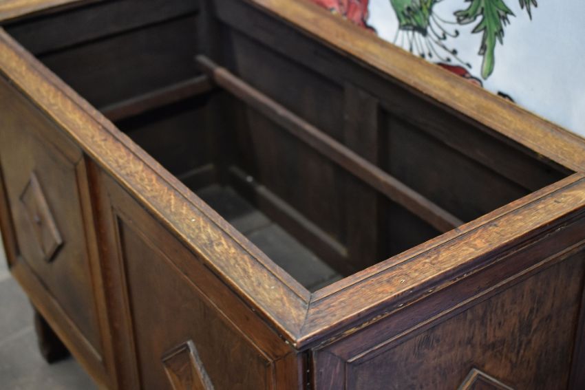 An unusual panelled oak blanket chest raised on four corner supports and with raised diamond decoration to each panel and with raised rectangular lid, 110cms wide