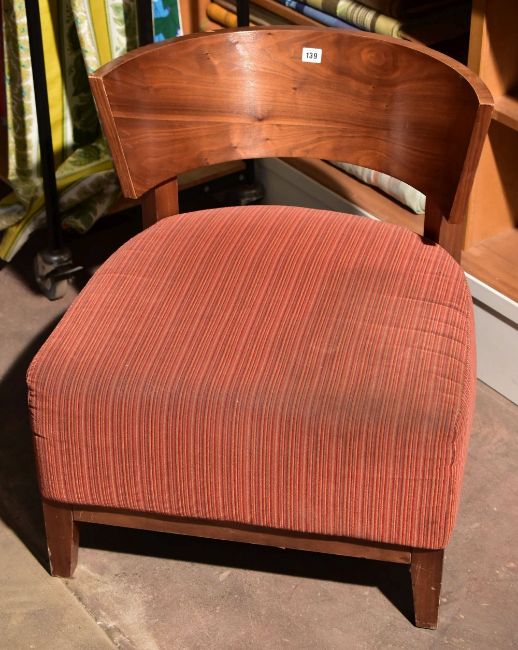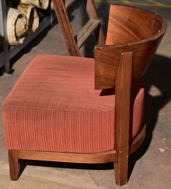 A matching set of three chairs with curved wooden backs and deep cushioned seats
