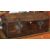 An antique dome studded leather trunk with large metal work escutcheons and having a floral fabric interior and iron work loop handles to either side
