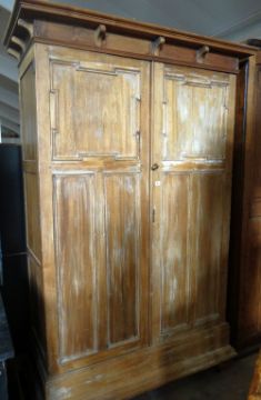 A limed oak two drawer armoire of panelled form and with raised cornice, 122cms wide x 210cms high