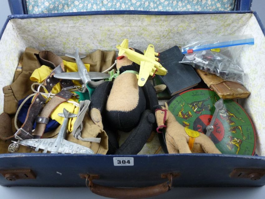 A vintage suitcase and contents to include a Boy Scout uniform, a felt monkey and horse, a tinplate race game wheel, a quantity of diecast planes etc