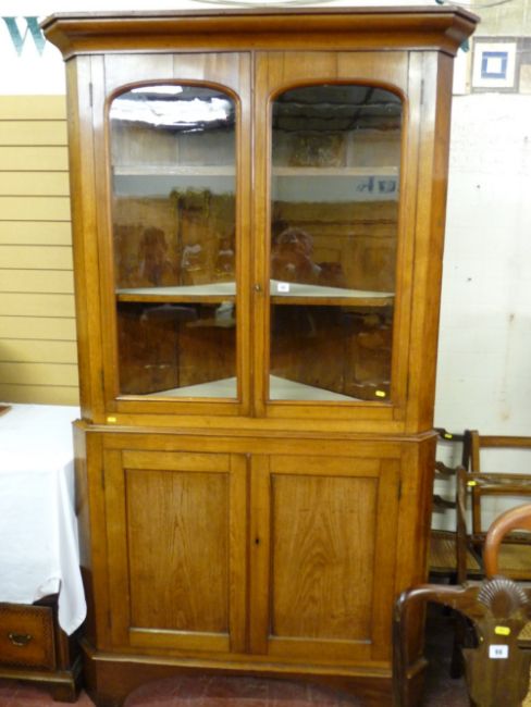 A late 19th/early 20th Century two piece oak standing corner cupboard, the upper section having two plain glazed doors to a base of two drawers with inset panels, 125 cms high