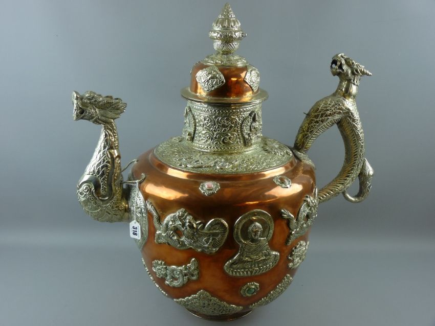 A substantial and very impressive Tibetan ceremonial tea kettle, copper body and lid with brass decoration and adornments of deities, dragons, framed agate roundels and pictorial panels with large dragon spout and handle, 63 cms high approximately, 63 cms handle to spout