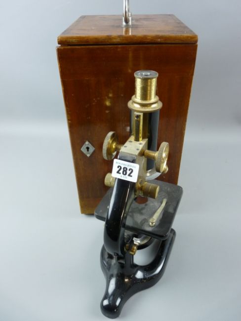A mahogany encased brass and black metal microscope by Prior & Co with four supplementary lenses and a small quantity of glass specimen slides