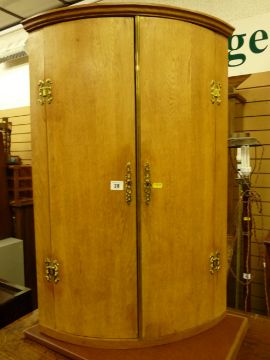 A light oak craftsman made reproduction two door bow front hanging corner cupboard with brass 'H' hinges and escutcheons etc