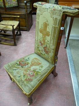 An Edwardian mahogany prie-dieu chair, the tapestry back with a cross amongst flowers, the seat with a chalice amongst flowers, 89 cms overall height