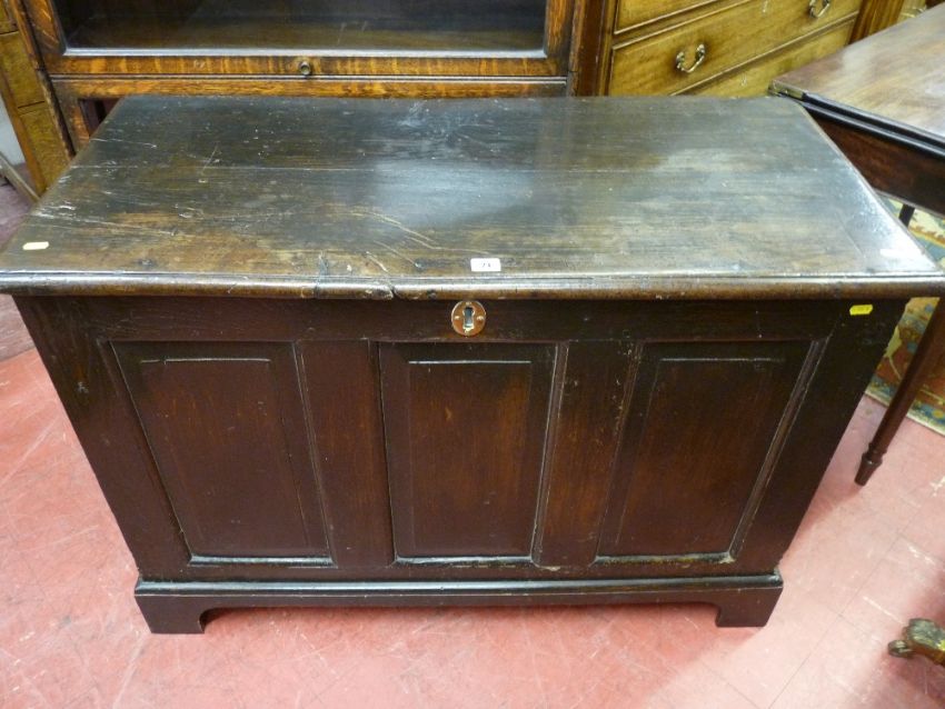 A late 18th Century oak dower chest having a triple fielded panel front on corner bracket feet, 106 cms long