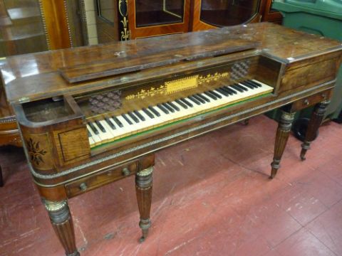 A William IV crossbanded and inlaid mahogany spinet with gilt metal mounts, ebony and ivory keys before a fretwork and inlaid main panel for 'S J Noble, 14 Abbingdon Street, London', two small frieze drawers, the whole supported by six brass capped turned and reeded legs on brass castors, 86 x 172 cms, 64 cms deep
