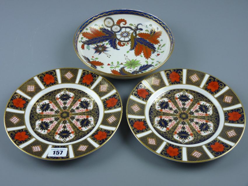 Two Royal Crown Derby '1128' pattern plates, 21.5 cms diameter approximately in a gilt highlighted Imari palette along with an early wheel pattern Imari shallow dish (English, possibly Spode), 21.5 cms diameter