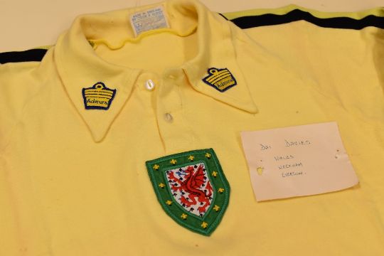MID-1970s WALES FA GOALKEEPER JERSEY BELIEVED MATCH-WORN BY DAI DAVIES in yellow bearing synthetic No.1 to the reverse, centred stitched Wales FC crest-badge, Admiral logo on each collar and label internally Condition: colours have held, pin-holes from presentation, structurally fine Provenance: Cwmtwrch RFC, handwritten card inscribed 'Dai Davies'