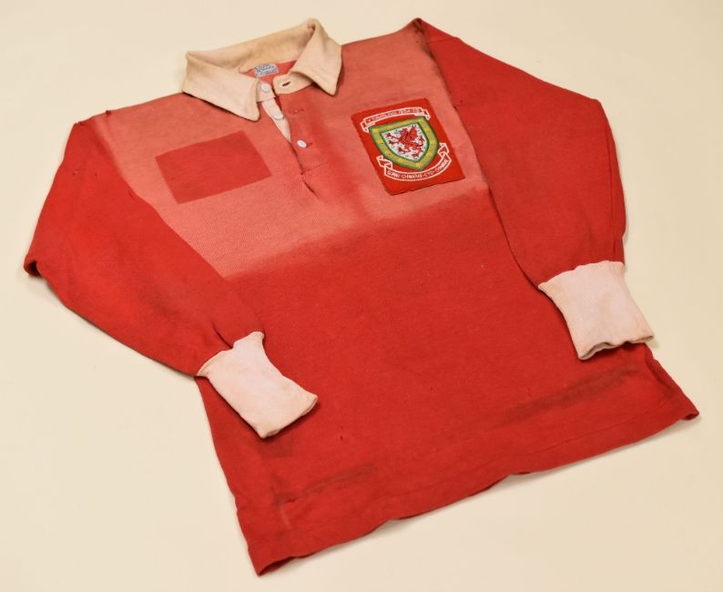 WALES INTERNATIONAL FOOTBALL JERSEY MATCH-WORN BY DEREK TAPSCOTT v YUGOSLAVIA, 22nd SEPTEMBER 1954, bears original No.8 to the reverse, complete with silk on felt stitched crest with match detail above, maker's label internally for 'Jack Sharp, Liverpool', Derek Taspcott b.1932 in Barry, South Wales was an inside forward (No.8) who played most famously for Arsenal and Wales but also for a host of South Wales clubs including his hometown club Barry Town. He won 14 caps for Wales, scoring 4 goals. Condition: fading to areas, structurally fine, pin-holes from presentation Provenance: Cwmtwrch RFC, handwritten card reads 'Wales v Jugoslavia, Presented by Derrick Tapscott'