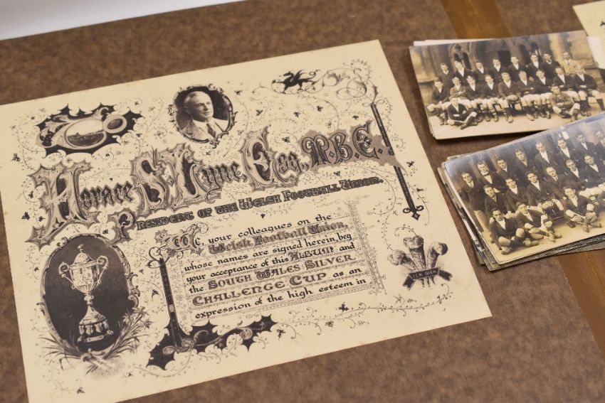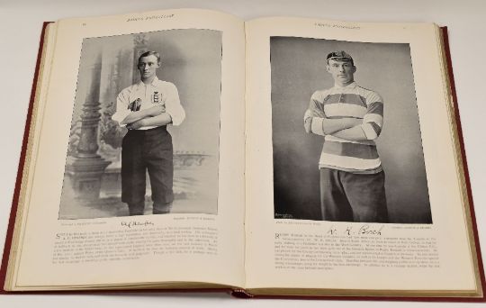 A HARDBACK VOLUME OF 'FAMOUS FOOTBALLERS' being 224 pages containing portrait photographs of influential 19th Century Association Football players, Rugby Football players and team photographs, clearly demonstrating for reference their attire and equipment; together with a 'SOUVENIR OF ALBUM PRESENTED TO HORACE S LYNE ESQ MBE by his Colleagues of the Welsh Football Union, October 1932' and a small parcel of vintage team photo postcards