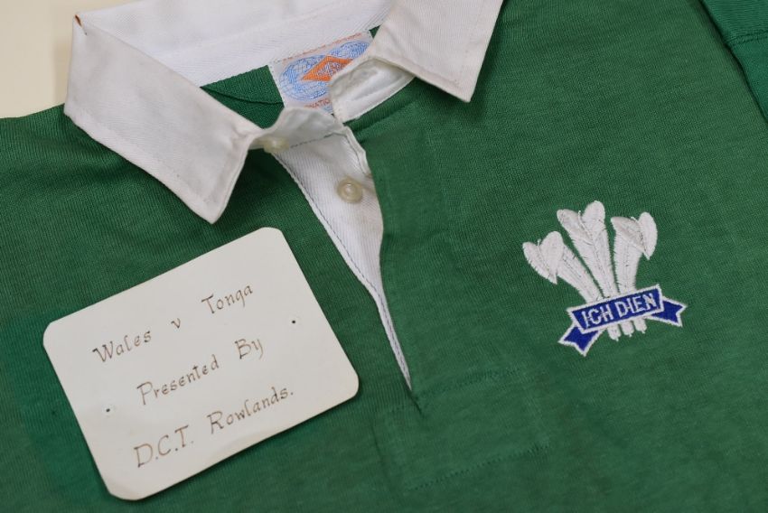 VINTAGE WALES RUGBY UNION INTERNATIONAL GREEN JERSEY, CIRCA 1980s, non-numbered, complete with stitched crest and Umbro label and worn Umbro logo to waist Condition: excellent, pin-holes from presentation Provenance: Cwmtwrch RFC, with handwritten card 'Wales v Tonga Presented by D C T (Clive) Rowlands'