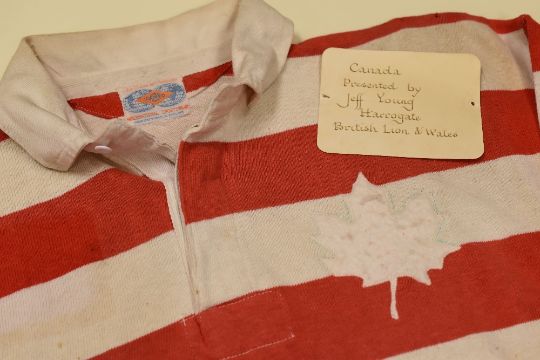 VINTAGE CANADA INTERNATIONAL RUGBY UNION JERSEY CIRCA LATE 1960s, bearing squad number 22 to the back, Umbro label internally Condition: structurally fine, some marks, pin-holes for presentation, wearable condition Provenance: Cwmtwrch RFC, accompanied by card 'Presented by Jeff Young...'