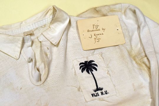 VINTAGE FIJI RUGBY UNION INTERNATIONAL JERSEY, CIRCA 1970s, No.16 stitched panel to reverse, stitched crest panel Condition: some marks, pin-holes from presentation Provenance: Cwmtwrch RFC, card 'Presented by J Kuvea'