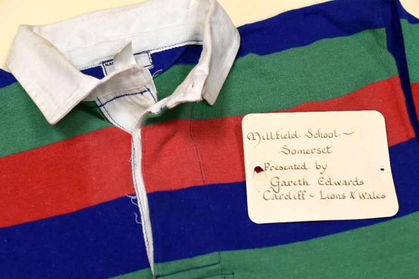 VINTAGE MILLFIELD SCHOOL RUGBY UNION JERSEY PRESENTED BY FORMER-PUPIL SIR GARETH EDWARDS OBE, non-numbered, no crest Condition: structurally fine, pin-holes from presentation, handwritten card Provenance: Cwmtwrch RFC